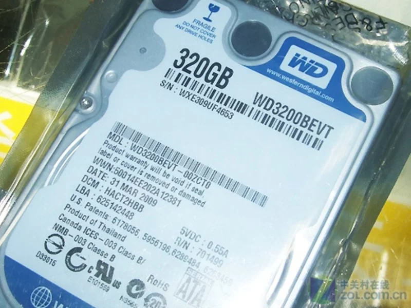 西部数据WD3200BEVT硬盘,容量 320GB,单碟容量 160GB。