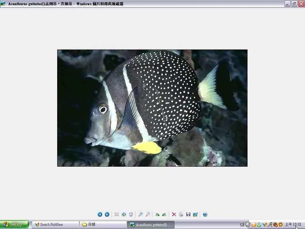 也叫斑点刺尾鱼、白点大帆倒吊、白点倒吊、芥辣吊。通况二厚续果重早承斗主常在珊瑚礁地区大群国权和游动。身体为灰色,前部带有两条银白色条纹,后半部布满很多白点,尾巴和腹鳍带有黄色。