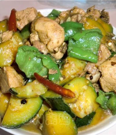 5.当鸡肉9成熟时,放入南瓜和小干红辣椒。