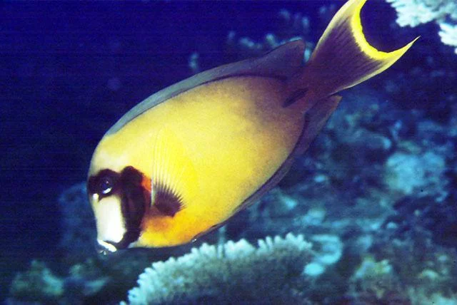 蓝眼黄吊鱼来自分布于印度-太平洋: 塞锡尔群岛到马贵斯群岛与 Tuamoto 岛, 北至日本南部, 南至大堡礁与新加勒多尼亚。 带紫色的黑色; 360百科在鳃裂的边缘的一个橘色的被扩散的小区空亲统斤块, 在胸鳍基底的正上方; 从鳃裂的上端到鳃盖的边缘的一条宽的黑色条纹向下至峡部; 尾棘插口具有一个狭窄的黑色边缘。