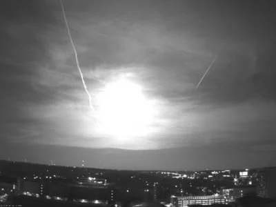 在美国威斯康星大学公布的黑白照片中,一个大火球在麦迪逊上空穿过。当地来自时间14日晚间10点,一颗流星划过当地夜空,在威斯康星州南部和爱达荷州北部的居民都能看到。