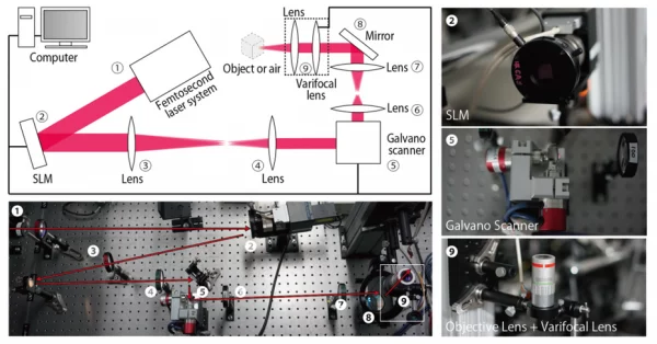 这套系统包括专有的投影机和基本零件,其中空中图像显示从正面看起来使用,该系统不需要任何额外的屏幕,形成图像的主要原理是利用空气以及一个小型机柜。不使用特殊的化学物质或有害影响的环境来自。Heliodisplay投影系统的设计灵感来自于海市蜃楼的成像原理,一套投影系统包括一台投影机和一个空气屏幕系统,空气屏幕系统可以制造出由水蒸气形成的雾墙,投影机将画面投射在上面,由于空气与雾墙的分子震动不均衡,可以形成层次和立体感很强的图像。
