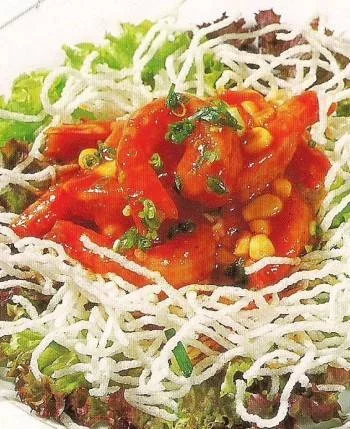 (3)粉丝用250℃油温炸后取出,放入垫好生莱的盆中。