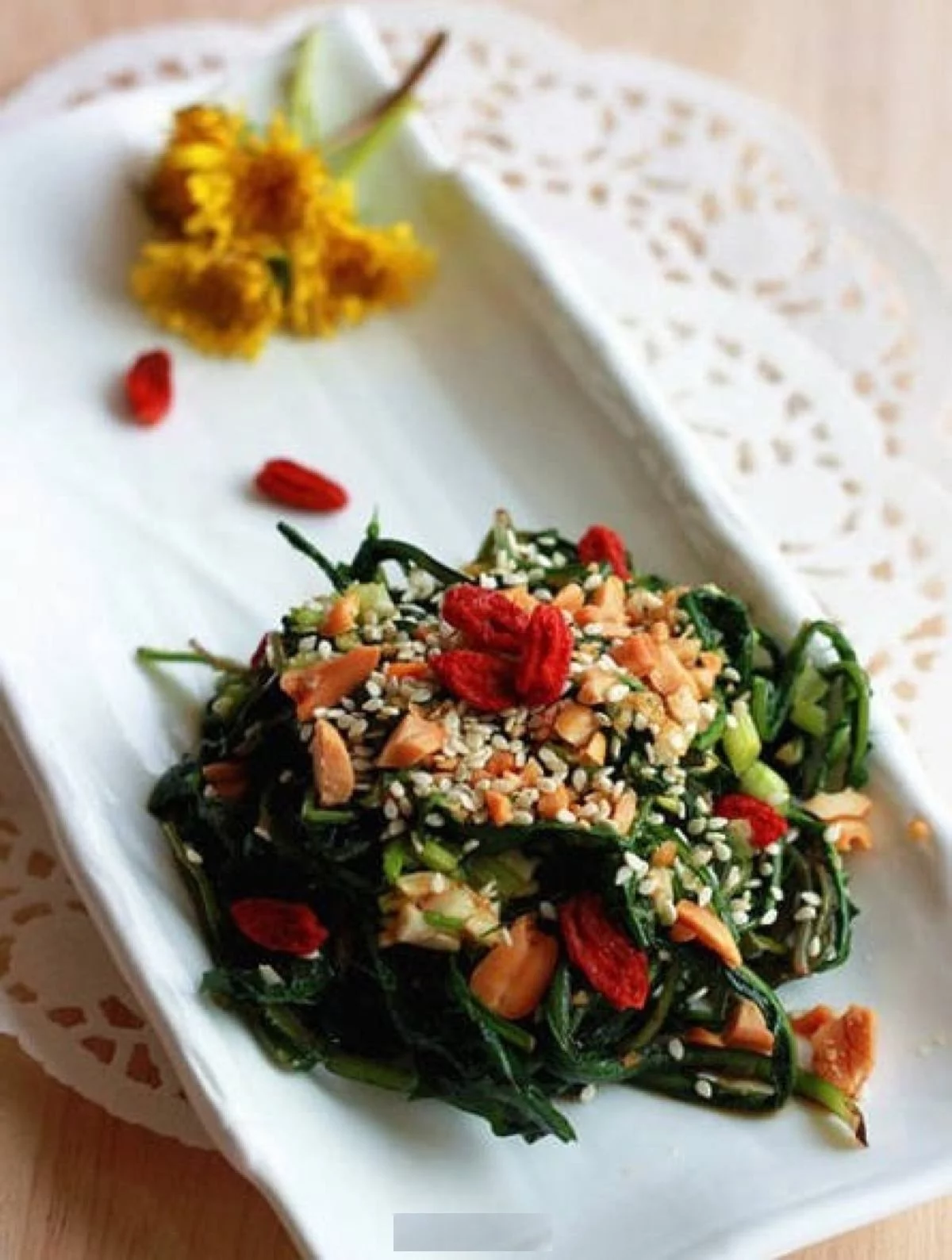 枸杞凉拌芝麻是一种食物,制作原料有枸杞嫩芽、金针蘑、白芝麻、砂糖、料酒、酱油。