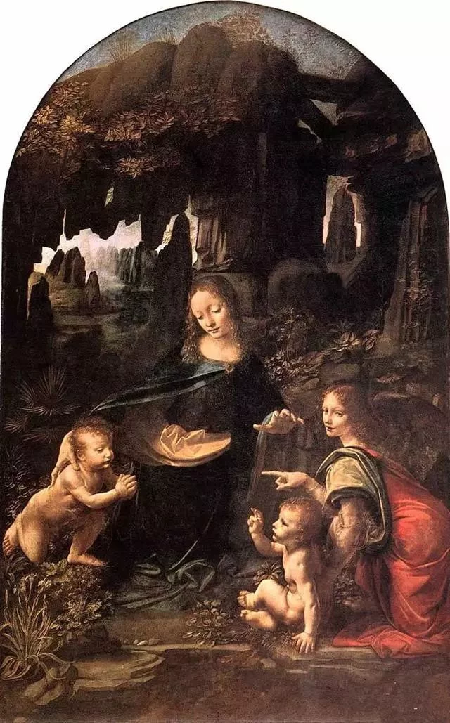 《岩间圣母》是达·芬奇受委托而在1483年开始创作的祭坛画。画中的圣母玛丽亚完全像一位普通的慈祥的母亲,她坐在那里,用亲切的目光,和蔼的微笑抚慰着身边的孩子。她的右边是小约翰--施洗者,左边是童年的耶稣和一个天使。幼小的约翰和基督耶稣在嬉戏玩耍。圣母用右手挽着小约翰,用左手遮在小耶稣的头上,好像要把这人和神在爱之中结合起来,耶稣旁边的天使用手扶持着小救世主,另一只手指着小约翰,面带一种温柔、奇异的微笑,其中充满了痛苦的预感。她的音容姿态,显得美丽绝伦。感情被高超的手法表达出来。她的手势似乎包含了两种含义,既为她的孩子祝福,又在保护她的孩子。尚在蹒跚学步的小耶稣坐在地上,脸上急显露出孩子的天真,又暗含了超出常人的智慧。画中人物与景色搭配和谐,给人以安宁祥和的感觉。圣母子、约翰、天使所处的山洞,传说是上帝创造世界的地方。那些岩壁像是庞大的深色结晶体。远处,从岩石中间看到带着潮气的阳光穿过雾云照在尖形的蓝山之上,神秘而又庄严。地下泉水在攀藤植物和石松根上潺潺流淌,地上遍布兽蹄形的水草叶子和淡白色泽兰花的花萼。在朦胧的洞穴中,人体轮廓渐渐淡弱,而面容在忽明的光线中如同细致的白玉,充满内在的生气。人神之母和自然之灵的水乳交融,使画面呈现出浓郁的诗意和深邃的哲理。