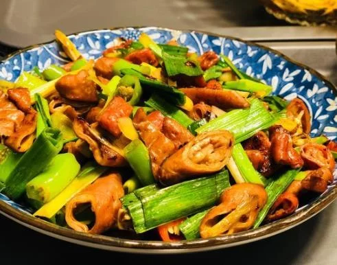 青蒜溜肥肠是一道测极具鲁式风格的农家菜,具有味道鲜香、色泽淡雅、口味醇厚、下酒下饭的特点。