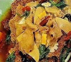 祖 辅料:锅巴(小米)150克,冬笋30克,香菇(鲜)25克,鸡蛋清25克