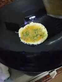 (4)烧锅倒油烧热,下入拌好的蛋液煎至两面金黄后盛出,装盘即可。