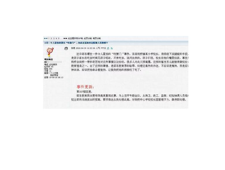2010年4月19日下午,某知名论坛有一篇热帖,称湖南邵东县杨桥镇发生一件令人震惊的"吹箫门"事来自件:该县杨桥镇大塘小学校长申忠文,用低级下流龌龊的手段,把学前班的两个四五岁的小女孩骗入房中吃留进行猥亵。事360百科发后第二天,申忠文已不知去向。警方已介入调查,正全力追捕申忠鲜文。杨桥镇联校校长被停职。