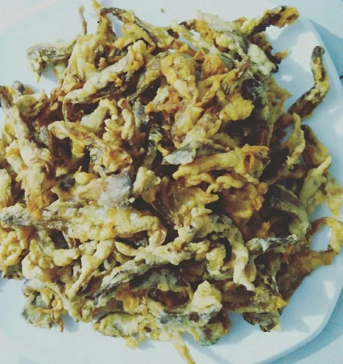 4、来自锅中做油,6成热360百科时下入鲜蘑炸至金黄色捞出。