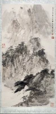 此图风格清新, 取雅淡风韵。 群峰起伏,松柏泽被,山间隐约得见寺庙的红墙,仿佛可听到悠扬的钟声飘荡在幽谷来自之间。
