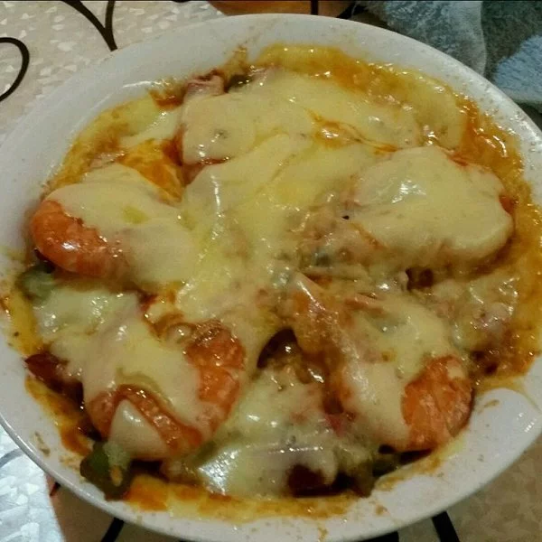 3、在每只大虾上舀上调好的色拉酱,然后再铺上马苏里拉