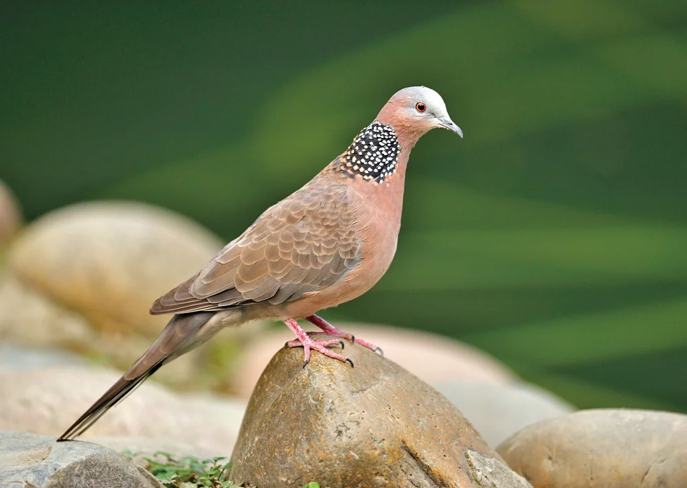 全长30厘米, 嘴暗褐色,脚真之编位化映置前含紫红色。颈下部至颈侧黑色,有白色斑点,因此,名为朱颈斑鸠。 经常出现于平地至低海拔平原、丘陵地带,城市中的校园、公园、行道树林等地方。