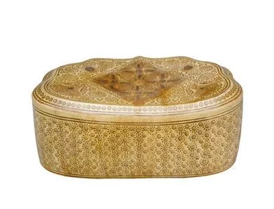 苏州博物馆收藏的"裴家花枕"长21.5cm,宽14.1cm,前沿高7.5cm,后沿高10cm,高9.5cm,唐代作品,两端微翘,略呈如意形,整个花枕除底部施绿釉外通体施黄釉。花枕的枕面中部镶嵌一组直径7cm的莲瓣纹团花,两侧各镶嵌一组4.25×3.8观看莲蕾纹团花。在三组团花纹饰的空间及枕的四壁还戳印无数细小圆圈,以示珠光绵连。枕面的外沿及枕壁的边沿各镶嵌二条褐色瓷泥条作