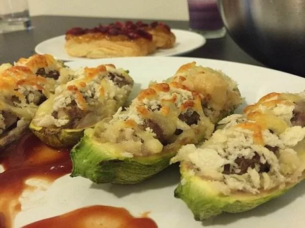 8、将拌好的馅料填入西葫芦外皮里。如果馅料充足,最好填的饱满一点。然后放入预热好上顶下火220度的烤箱,烤20-25分钟。