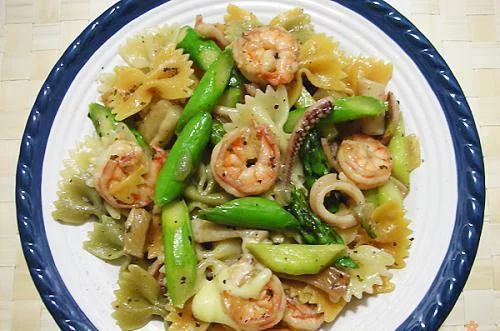 蝴蝶意面、芦笋、虾仁、鲜瑶珠、鲜鱿鱼、豌豆、玉米