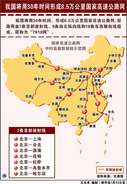 七条"首来自都放射线"、十一条南北纵向线和十八条东西横向线组成,简称"七一一一八网",总共约8万5千公里,覆盖10多亿人口。