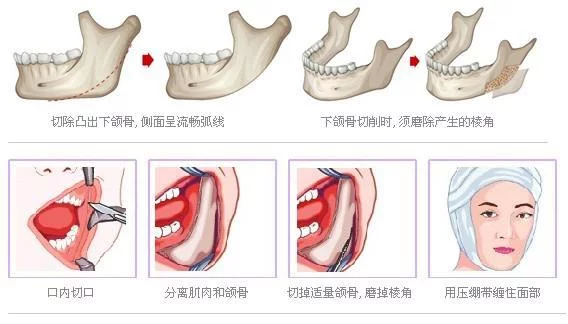从口内来自截除下颌骨肥大。一般采用气管插管全麻,口内最末磨牙外,切开粘膜达下颌骨区骨膜,分离适当范围,并充分暴露后,以摇摆锯、截除适当部分下颌骨骨,再磨平止血后,将骨膜复原缝合,再缝好粘膜即可。