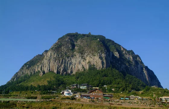 山房山 耸立在济州岛西南部的平原一带,是一座呈火山模样的钟状火山体。龙头岩南侧的绝壁150~300m高的地方,有很风化穴和崖锥,海拔150m的地方,有长约10m、宽和高各约5m的山房石窟,作为海蚀洞窟,在此可眺望到美丽的海面,是瀛洲十景之一了。