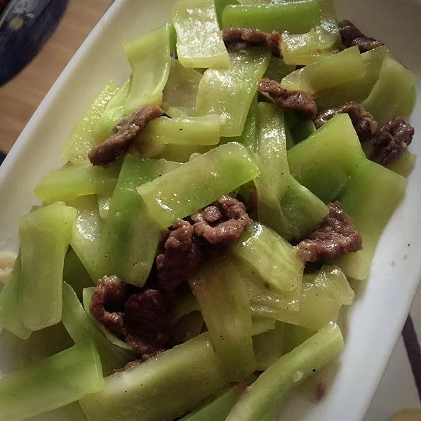 主料:嫩牛肉150g、莴苣100g、青蒜25g