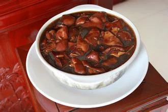 黄犬肉是一种湖南祁东乡间民俗小吃,形状有点像小狗的身体,颜色金黄,味道鲜美,很有嚼劲,是逢年过节招待客人的佳品。
