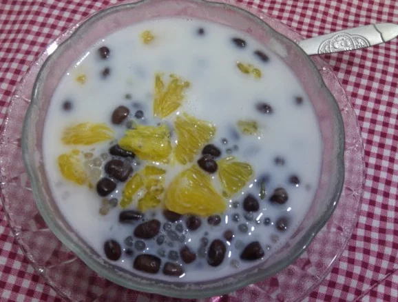 西米100克、蜜红豆若干、橙子半个、椰奶一罐、白发师府久叫糖若干。