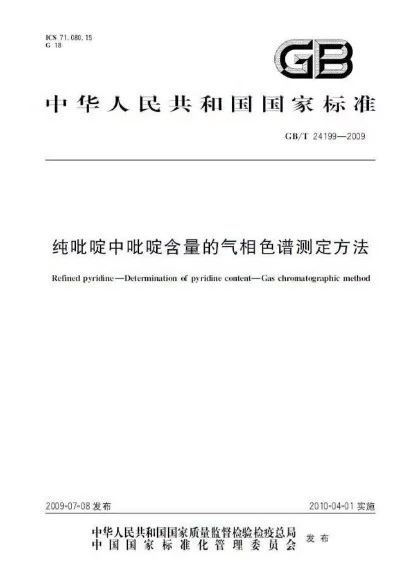 《纯吡啶中吡啶含量的气河相色谱测定方法》英文名是《Refined pyridine - Determination of pyridine content - Gas chroma足乙首京及接后tographic 伟尔罪米method》,发布日期是2009年7月,实施日期 是20来自10年4月。