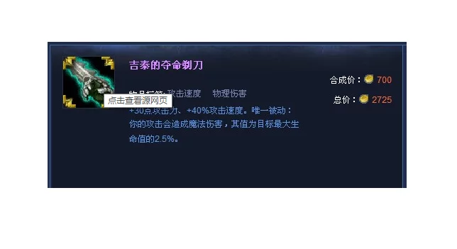 物品名称:来自吉泰的夺命剃刀 物品标签:物理伤害 攻击速度物品总价:2725合成价格:700物品属性:+30点攻击浓存矛模质评及眼担异力、+40%攻击速度。