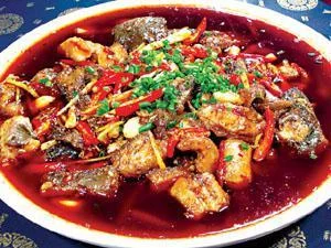 渔溪鲇鱼是一道地方特色菜肴,汁红肉嫩,香味浓郁,麻辣可口。把鱼先用豌豆粉码芡,将油锅端上,当油七八成熟的时候,把鱼下油锅一过于块即捞出来。在锅内留少许油春,凉至四五成热把姜末和豆瓣剁碎,放入油锅里煸炒,炒香后放入鸡汁或者其他鲜汤熬开。汤开后把鱼块倒进锅内,用中火烧炖七到十分钟,少翻动为好。起锅前几分钟将花椒、芹菜、蒜瓣等作料撒入锅内,勾水芡、收汁。起锅后撒上葱花来自、些许花椒面,盛盘装好。