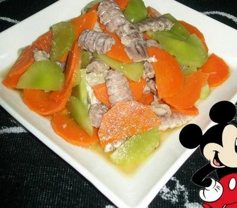 材料:琵琶虾肉肉、甘笋片(来自胡萝卜片)、莴笋片
