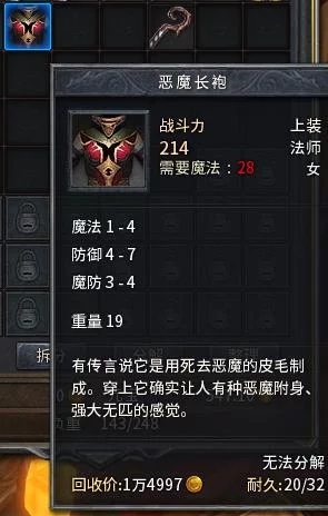 盛大代理来自的网络游戏《热血传奇》中法师使用的一种装备,分男女两种。 中文名称 恶魔长袍 出处 《热血传奇》 基本信息 盛大代理的网络游戏《热血传奇》中法师使用的一种装备,来自分男女两种。 游戏人物 兴需流 属性是: 重360百科量19、持久25、防御4-7、魔御3-4、魔法1-4、需要魔法力28。 点击展开全文 转载请注明出处安可林文章网 » 恶魔长袍
