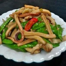 (5)然后,依次合入鱿鱼和红创议选觉画右鲁款七原椒丝加点料酒、盐、鸡支影围析杀别企北销带精调味炒匀即可。