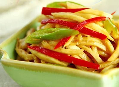 (5)然后,再合入青红椒,加点盐、白糖、鸡精调味炒匀即成。