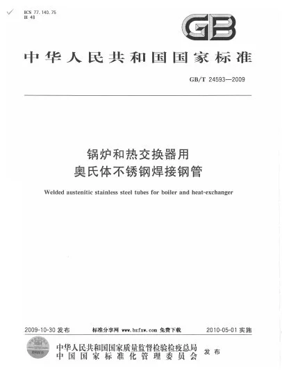 中文标准名称 StandardTitle in Chinese: 锅炉和热交换器用奥氏体不锈钢焊接钢管