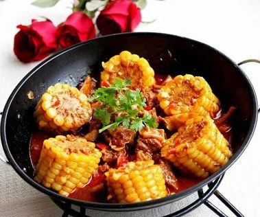 1、牛肉洗净后,切成3cm见方的块,放入清水中浸泡1小时后,倒掉血水,再次冲洗干净后,沥干备用。玉米去皮洗净后,切成小块。