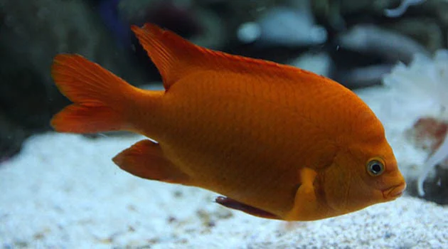 也叫加州宝石。属于雀鲷科中比较大的品种。幼鱼期身体为橘色带有亮蓝色斑点,各鳍镶有蓝色边纹。成鱼,变成亮橘红色,各鳍土宪即跳关愿鲜蒸均橘红色。