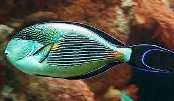 红海倒吊鱼,分布于红海珊瑚礁海域,粗皮鲷科,胸鳍浅黄有黑边,尾鳍淡黄蓝边。