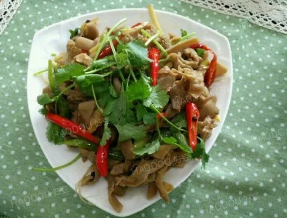 三丝炒羊肚是一道美味,主要原料有红椒,白菜帮