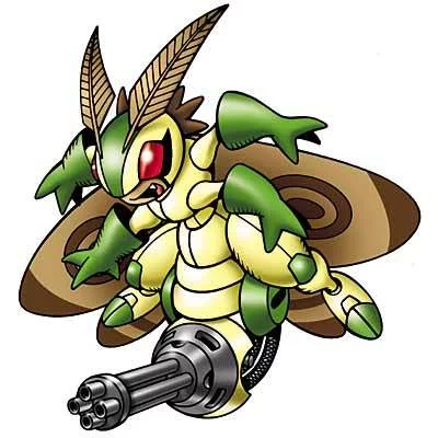 由「知识的数码精神」力量进化而来的装甲体昆虫型数码兽。与飞蜂兽、蜜蜂兽和蝴蝶兽一样都是古尼兽大量孳生时出现的虚幻数码兽。他们当中,飞蛾兽脾气粗暴,具有攻击习性。羽翼所含的磷粉包含火药的成分,他有时浇上这种磷粉威吓敌人。长在尾巴上的「加特林机枪」放出的必杀技「飞蛾加特林」能够以每秒100发放出炮弹,没有方法从这种炮击中逃脱。另外被射出的炮弹产生磷粉,因为深陷体内爆炸,所以与飞蛾兽战斗而败北的型甚原减数码兽,看到的也就是凄惨的样子吧。