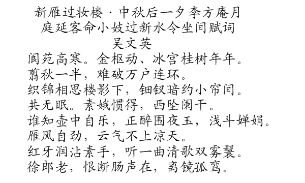 转载请注明出处安可林文章网 » 新雁过妆楼·中秋后一夕李方庵月庭延客命小妓过新水令坐间赋词