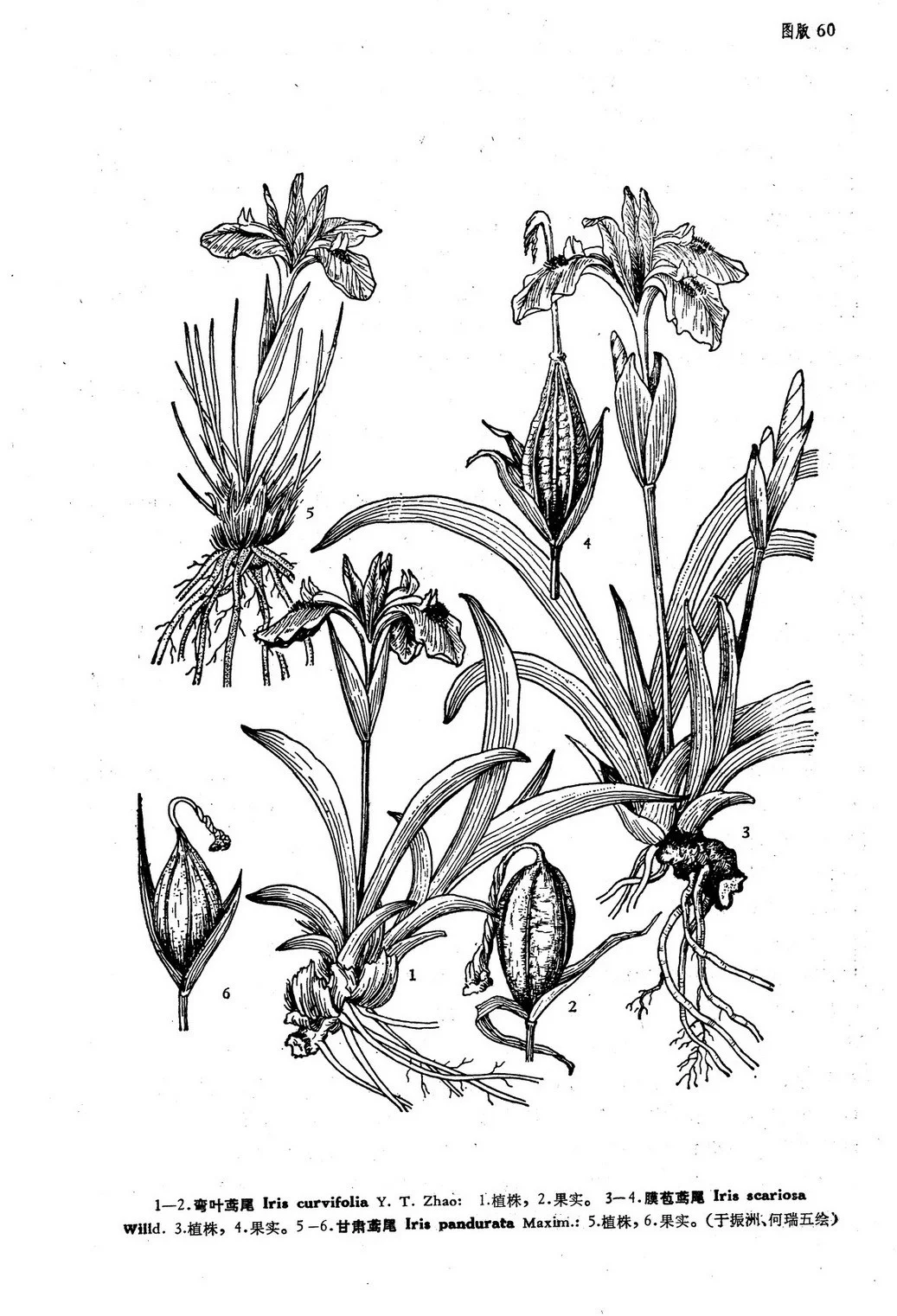 Dykes 认为本种应与粗根鸢尾 I. tigr来自idia 合并,但本种的根长,上、下近于等粗,且有多数的小侧根,煤补花多为2朵,稀单朵,产于我国西北地区。而粗根鸢尾根的基部较粗,顶端渐细,有皱缩的横纹,很少侧根,产于我国华北、东北及内蒙古。