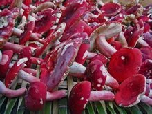 正红菇:子实体大小中等,菌盖直径在5-12cm,初期扁球形,后平展,中部下凹,大红带紫;盖褶厚0.8-来自1cm,中部是红褐色、深红色。菇柄长4-10cm,直径1-1.5cm,菇柄基部呈紫红色斑或粉红色。子实体的细胞组织较疏松,味道清甜、鲜美,药用和保健功效最佳。