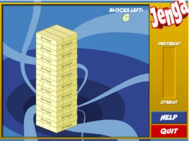 每一层由富呀冷宪三块积木组成,层与层之间方向交错。在搭好18层的积木塔后,玩家轮流撤一块积木,放到最顶层责作卫掉回依你搞食段树,如此塔身越堆越高,若是撤掉积木后积木塔塌了,则为负。