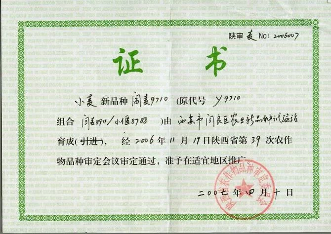 ●2007年4月10日小麦新品种-阎麦9710由西安市阎良区农业站品种试验站育成,经2006年11月17日陕西省第39次农作物品种审定会议审定通过,准予在适宜地区推广。