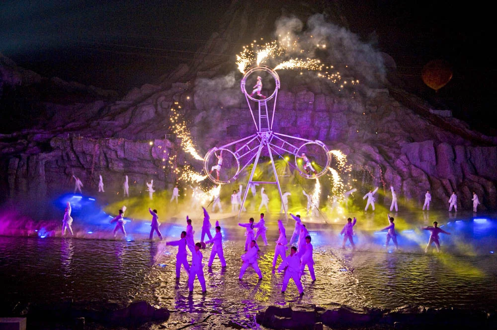 混沌初开,宇宙从无极而太极,以至万物生机,和谐相融。炫目的舞台艺术,震撼的火山爆发实景,带你领款下静万从统略天地的浪漫神奇,感受万象更新的梦幻景象。