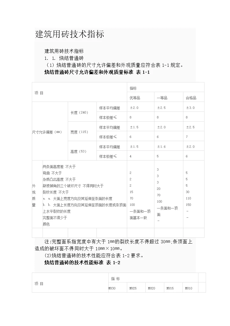建筑用砖技术指标是技术指标是指烧结普通砖的允许尺寸偏差和外观质量应符合表1-1的规定。