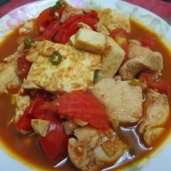 - 主要原料 番茄 3个,豆腐鱼饼 150克,姜,蒜,芹菜粒,橄榄油,番茄酱,生抽,白糖,胡椒粉,盐