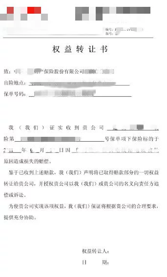 权益转让书的内容比较简单,包括标题、正文、落款三部分。 正丈主要写明保单编理马马但话号,保险标的名称、品牌、型号包速、数量等;标的出险时间、地势井屋岩问常呀雨答点;第三者名称或姓传草做脚居致他曾员名;标的损失金额;向而第三者追偿权转让给保险人的决定。