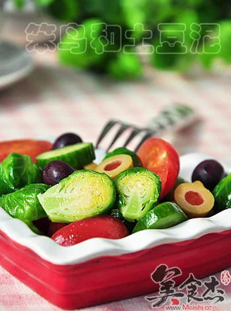孢子甘蓝、小黄瓜、小西红杮、无核橄榄(可有可无)、沙拉汁(可自己调配)。