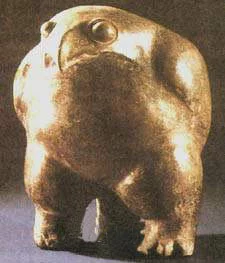 陶鹰鼎,属新石器时代,1957年凯出土于陕西省华县太平庄。通高只有36厘米,但看上去显得威武而雄壮。鹰的前胸为鼎腹,饱满粗壮,器口开在鹰的背部。鹰 的双目圆睁,周身光洁未加纹饰,喙部呈有力的勾状。鹰鼎整体结构简洁,体积感很强,鹰的双足和尾部为鼎足稳定地撑柱于地,后收的双翅围过鼎的中后部,形成 一种前扑的动势,配上鹰头部的大眼、利喙,使这只鹰显得威风凛凛,桀骜雄猛的气势。现藏于中国国家博物馆。